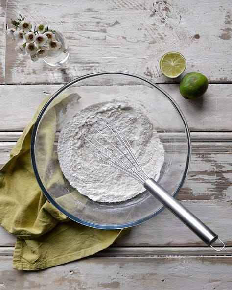In a large bowl, whisk together the sugar & the lime zest, ensuring the zest is evenly dispersed. Add the eggs, yogurt, & melted butter to the sugar and whisk until thoroughly combined.