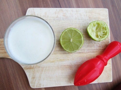 Pour into 4 glasses, add in the lime juice & stir well.